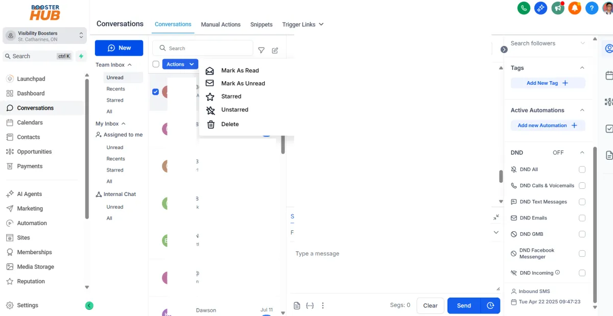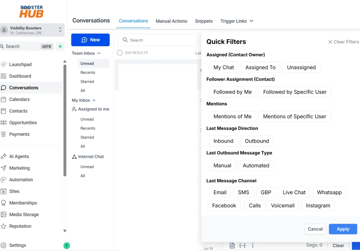 This opens your unified inbox where you can manage all incoming/outgoing messages (SMS, email, Facebook, Instagram, GMB chat, etc.).